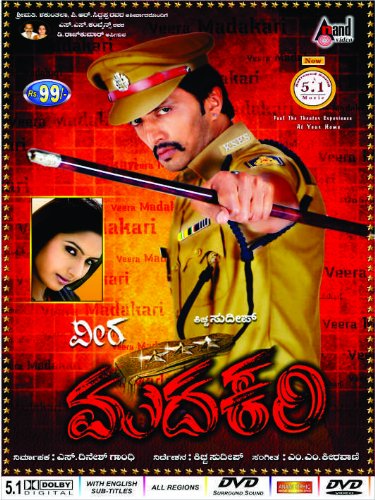 Veera Madakari is a action thriller kannada blockbuster directed by Sudeep. He is seen in dual role with debutant Ragini Dwivedi. The story revolves around Muttai Satyaraju, a conman who falls in love with Neeraja (Ragini Dwivedi) Meanwhile in the village of Devgarh, Madakari, an honest police officer is slained by Babjee (Gopinath Bhat) and his brother Titla and his son Munna. Later, Satyaraju dones the identity of Madakari and takes revenge on the murderers to seek justice in honour of the police officer – Madakari